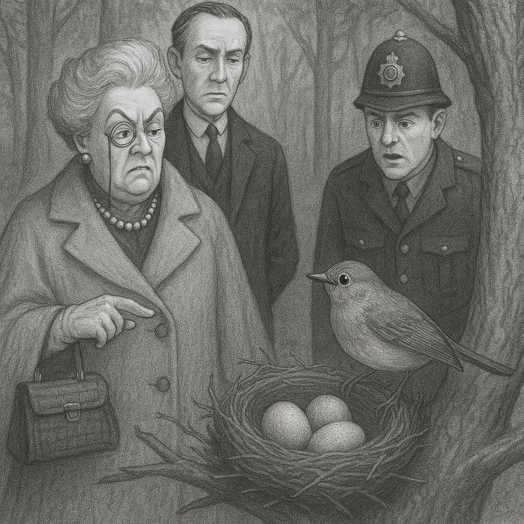 The officers wisely chose not to arrest the birds. Instead, they recorded the incident as a “domestic misunderstanding involving avian hues,” and gently suggested that Mrs. Bleachley might refrain from inspecting trees without legal counsel.
